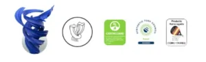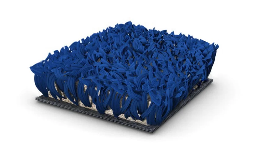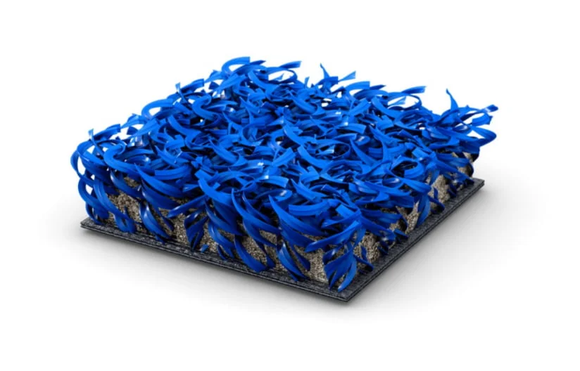 PADEL MFT hochwertiges Monofilament in den Farben Blau, Grün, Ton, Rot, Rosa oder Schwarz. Polyethylenfasergras, texturierte (gelockte) Monofilamente, 10 mm hoch und 170 μm dick. 6 Monofilamentfasern pro Knoten und 50.394 Knoten pro m2 (insgesamt: 806.304 Filamente pro m2). 8.800 Dtex Gras mit einem Gesamtfasergewicht von 1.353 g/m2. Belag aus einer doppelten Schicht aus Polypropylen, gewebt mit fibrilliertem Vlies und Latex, mit einem Gesamtgewicht von 2.504/m2.